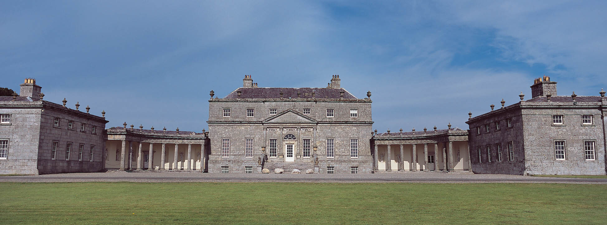 Architectural description: This mansion consists of seven bays of two storeys over a basement. Doric collonades attach the main house to two pavilions which are also linked to outbuildings by rusticated walls. The house of dressed granite is fronted by a pedimented entryway with three-quarter Doric columns and is topped by a hipped roof. The pavilions and colonnades possess a parapet with ornamental urns. Sash windows of six-over-six configuration are to the principal storey, while those of three-over-three are to the first floor. Baroque and Rococo plasterwork fills the house as do other fine details such as marble chimneypieces. The house exists within a large and beautiful demesne which is entered to the right of the house through a triumphal arch.